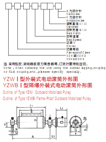 該產(chǎn)品是供各種固定式帶式輸送機(jī)、斗式提升機(jī)、卷?yè)P(yáng)機(jī)等配套的新型驅(qū)動(dòng)裝置。其內(nèi)部采用行星擺線(xiàn)減速機(jī)構(gòu),使電機(jī)外露與滾筒直聯(lián),具有承載能力大、過(guò)載能力強(qiáng)、傳動(dòng)平穩(wěn)、噪音低、壽命長(zhǎng),使用維修方便,操作安全可靠等優(yōu)點(diǎn)。可滿(mǎn)足各種逆止、包膠等要求。隔爆外裝式電動(dòng)滾筒其隔爆標(biāo)志位dl、dllAT4。dl適合于有甲烷或煤塵礦井中,dllAT4適合于有I、IIA級(jí)T2~T4組爆炸危險(xiǎn)性混合物存在的場(chǎng)所,dllBT4適用于有I、IIA、IIB級(jí)T2~T4組爆炸危險(xiǎn)性混合物存在的場(chǎng)所。